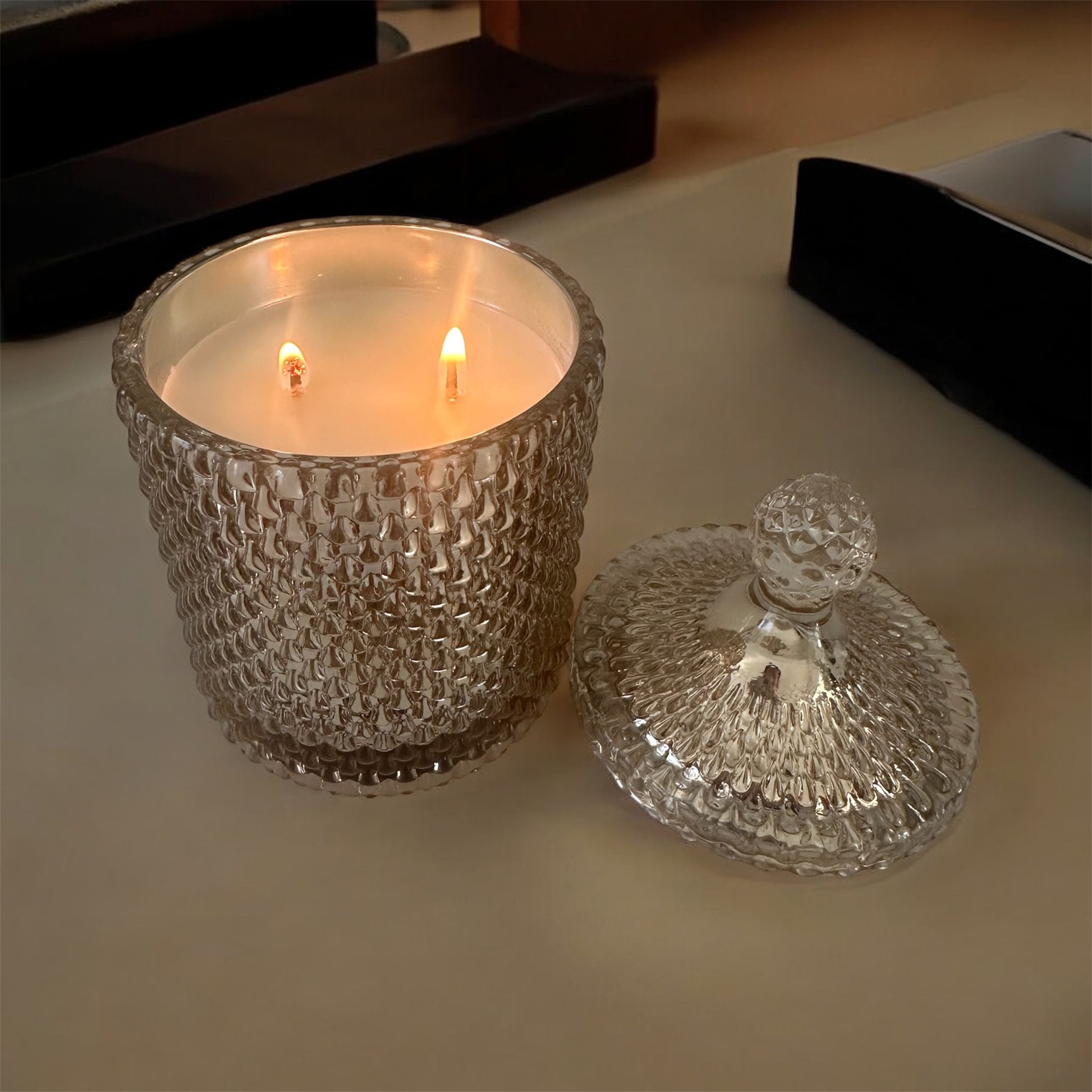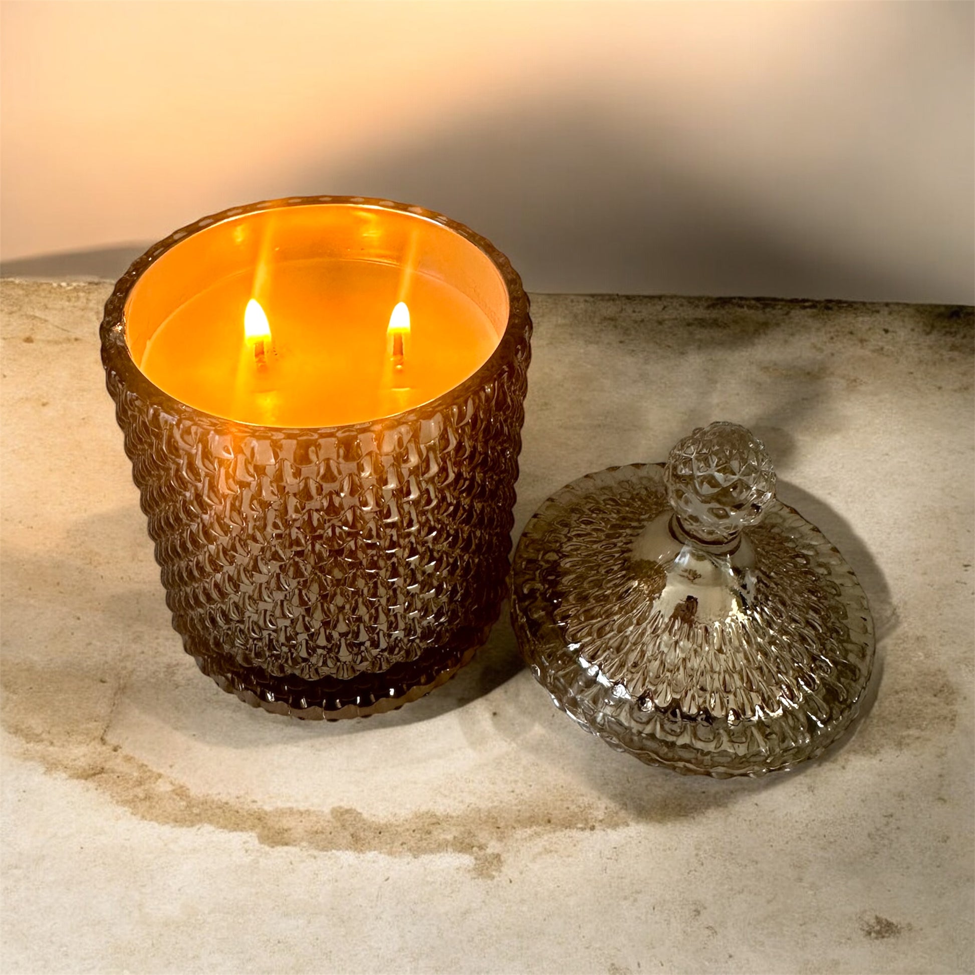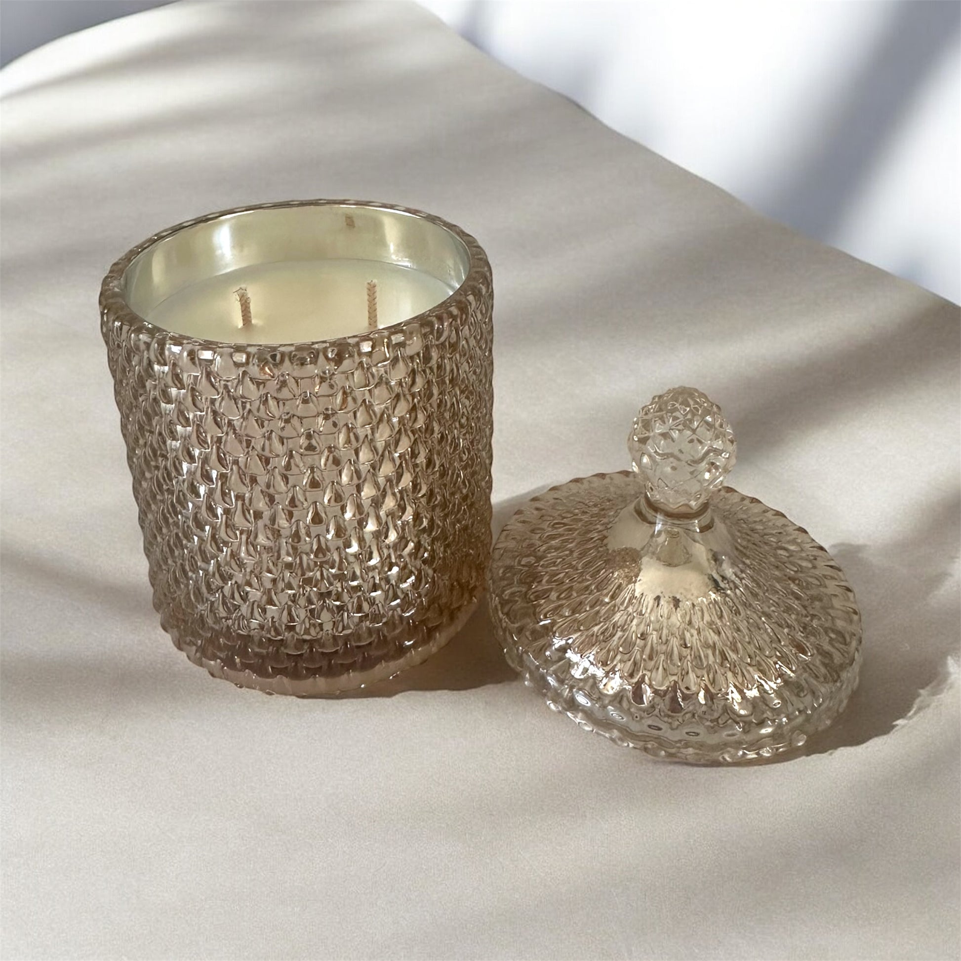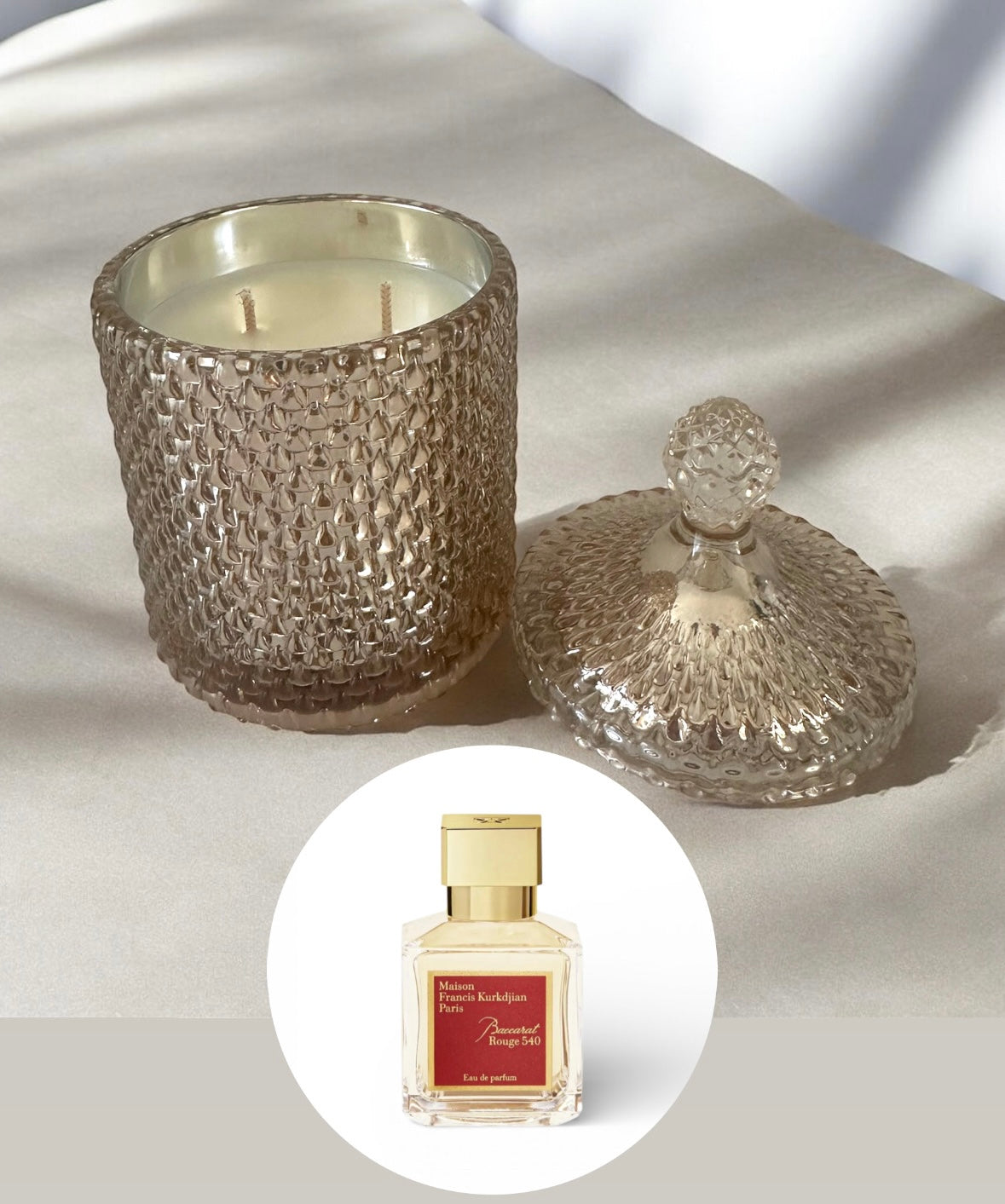 Hand-poured in small batches, this elegant double-wicked candle is finished in a stunning champagne-coloured tear drop vessel and fragranced with a Baccarat Rouge–inspired scent—rich, warm and irresistibly captivating.